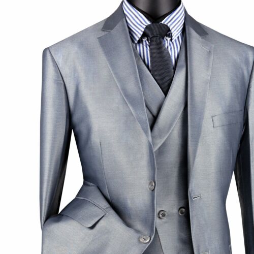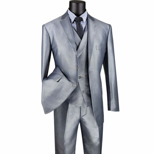 VINCI Men's Gray Shiny Sharkskin 2 Button 3 Piece Modern Fit Suit NEW