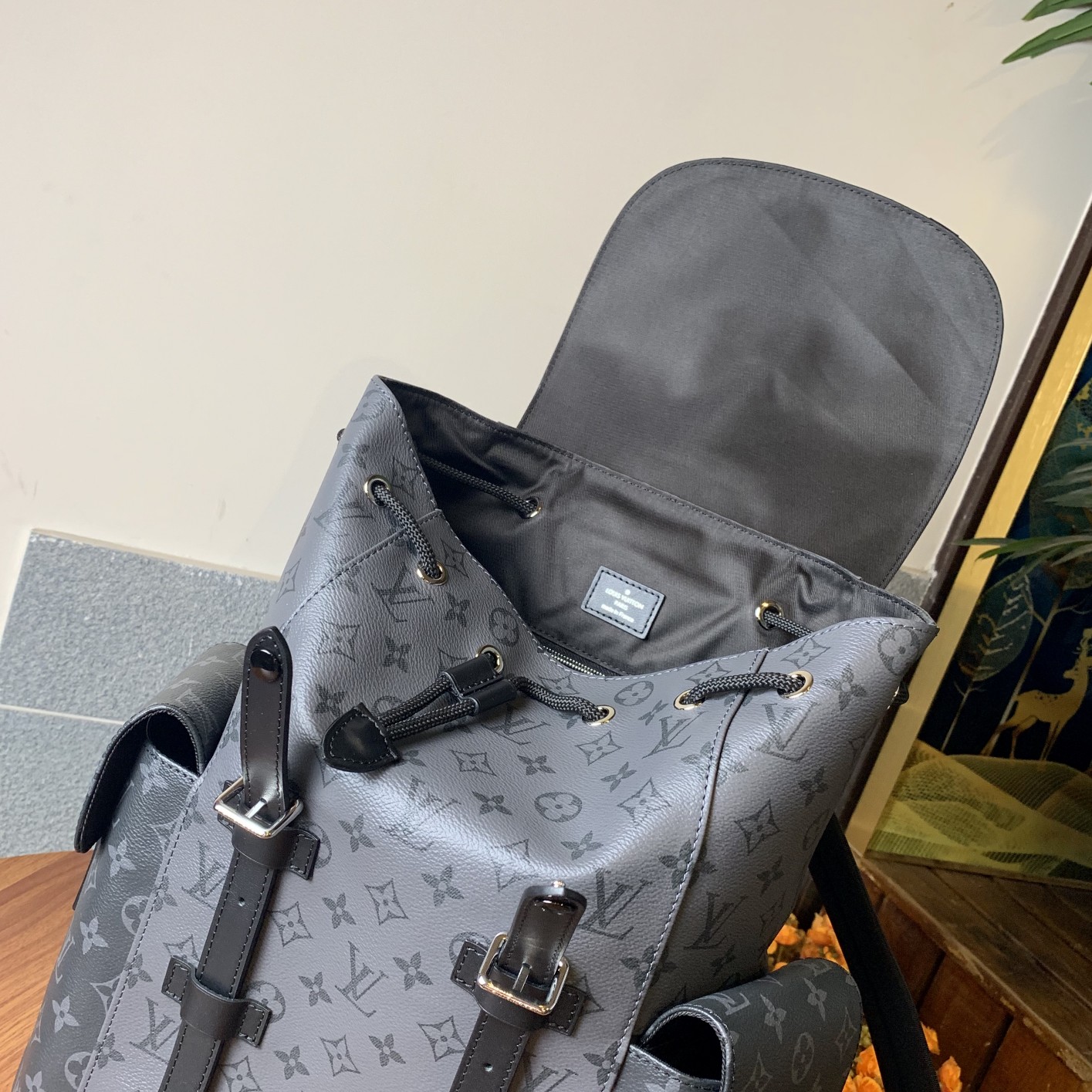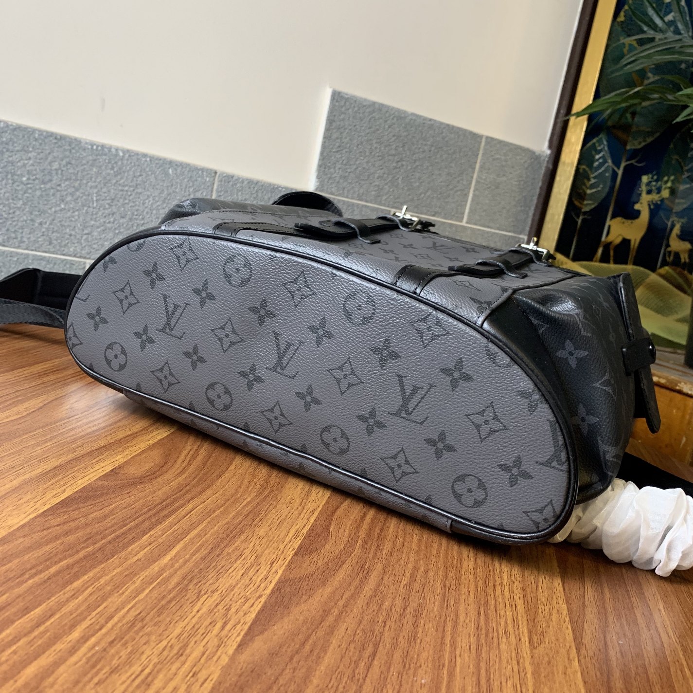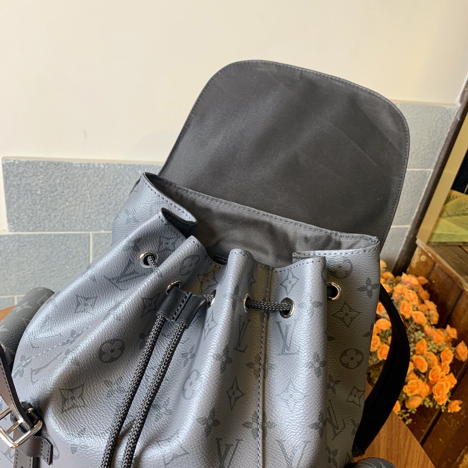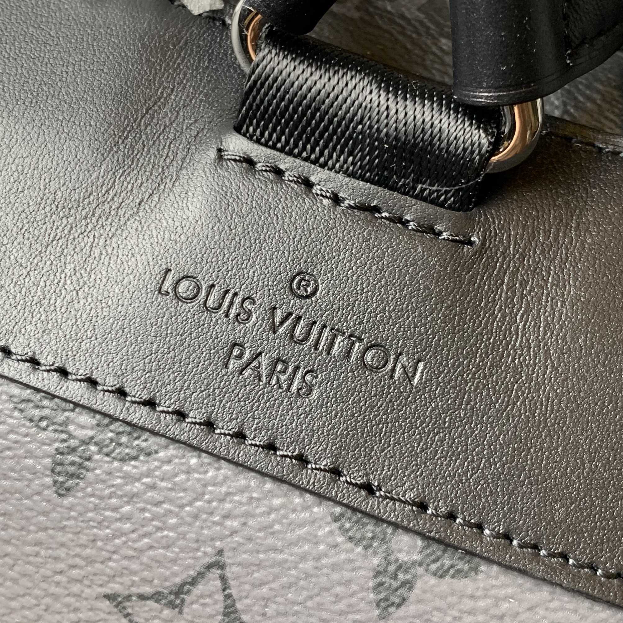 Monogram eclipse coated canvas and monogram eclipse reverse coated canvas fabric lined with cowhide trim silver metal trim adjustable shoulder straps top leather handle vertical cover opening and closing buckle and rope opening and closing 2 side bags 1 inner bag zipper inner bag with ipad inner bag