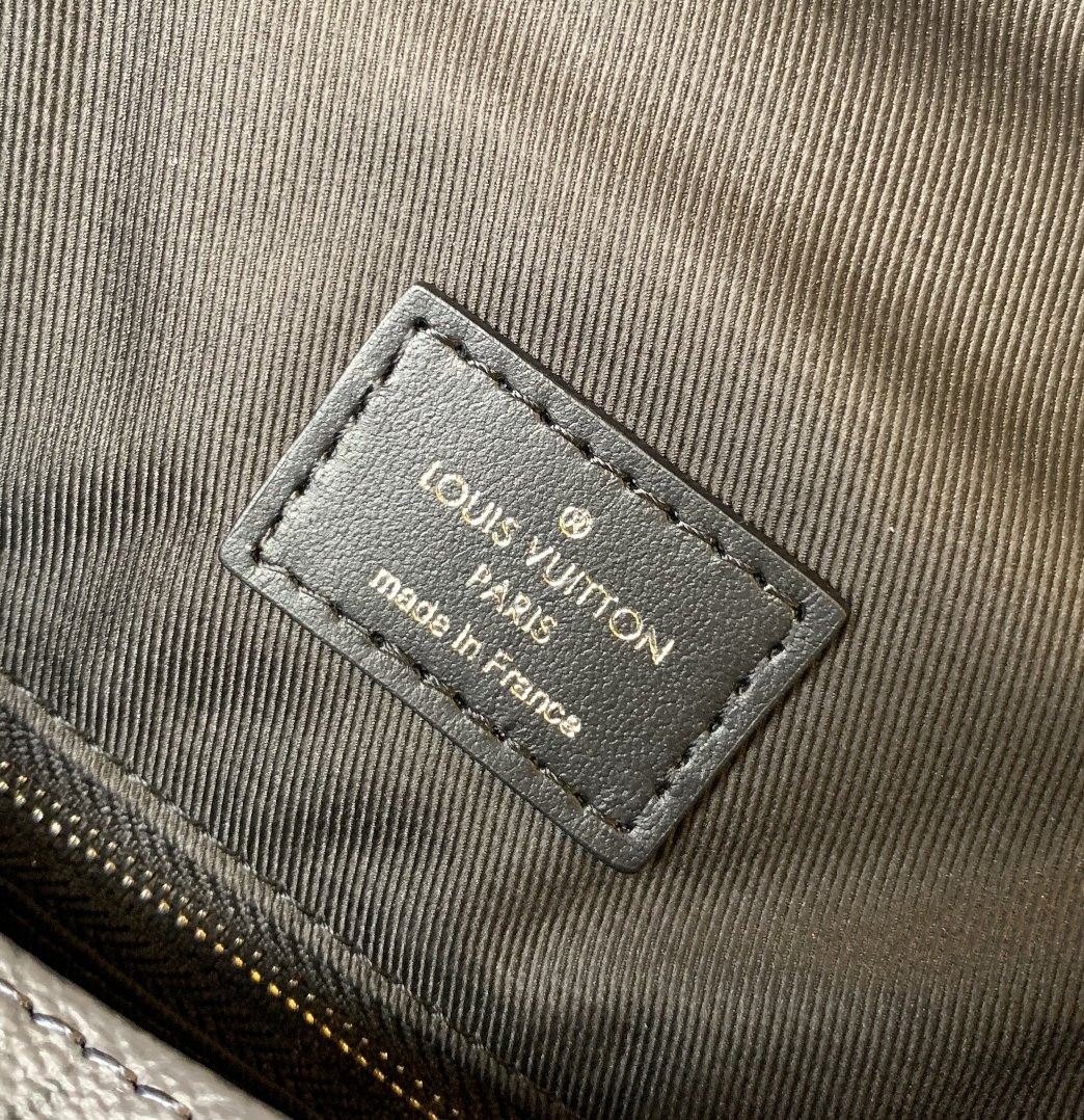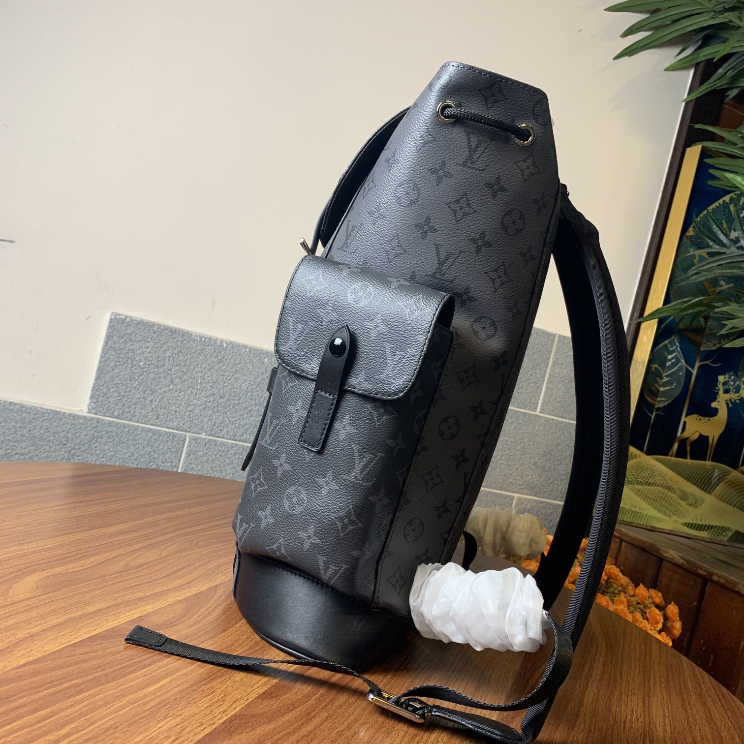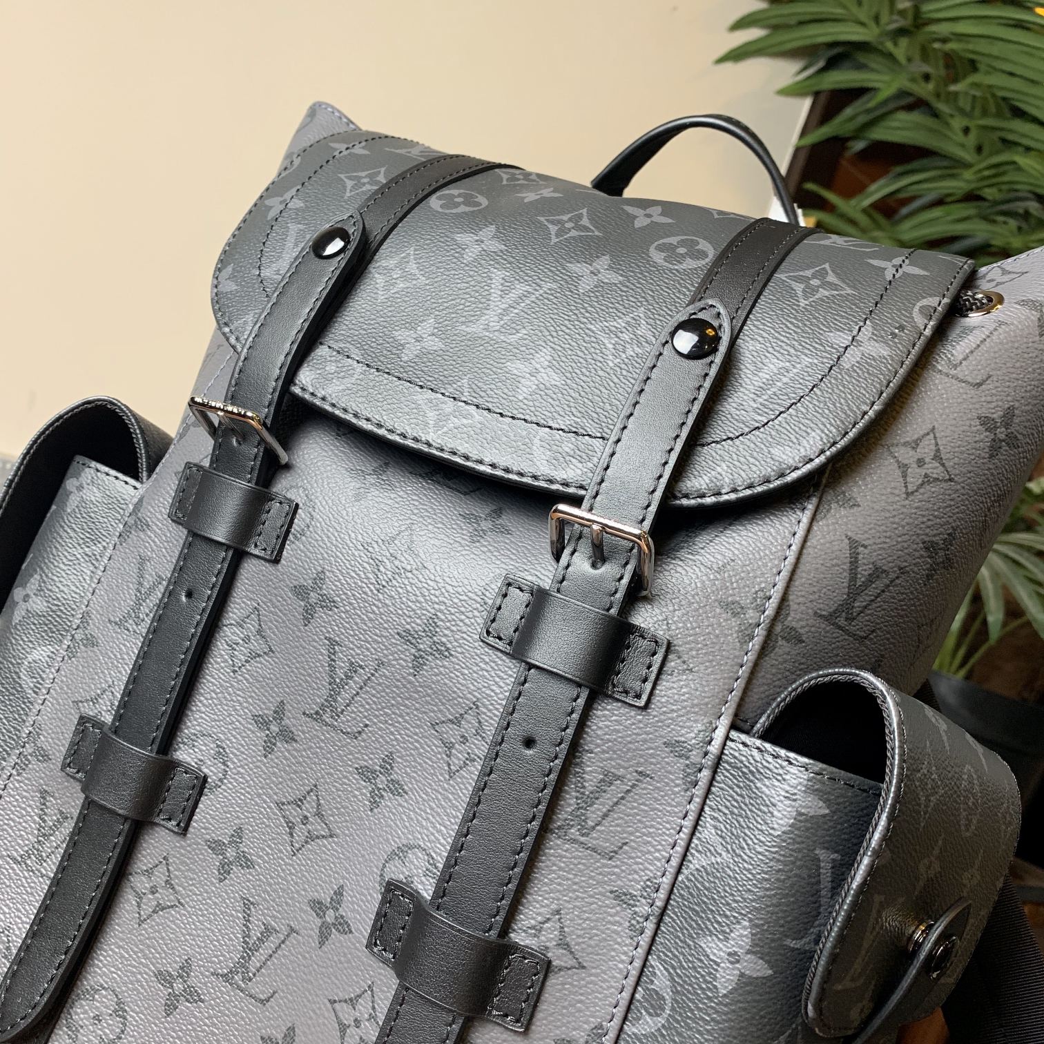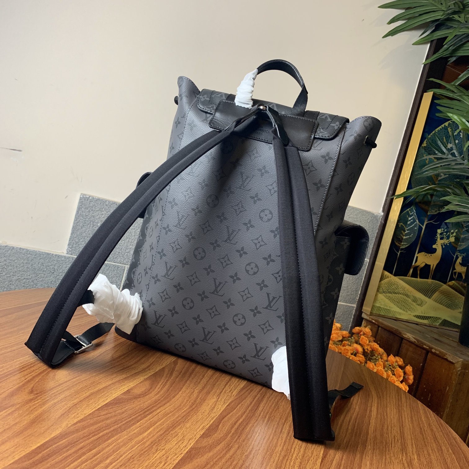 Monogram eclipse coated canvas and monogram eclipse reverse coated canvas fabric lined with cowhide trim silver metal trim adjustable shoulder straps top leather handle vertical cover opening and closing buckle and rope opening and closing 2 side bags 1 inner bag zipper inner bag with ipad inner bag