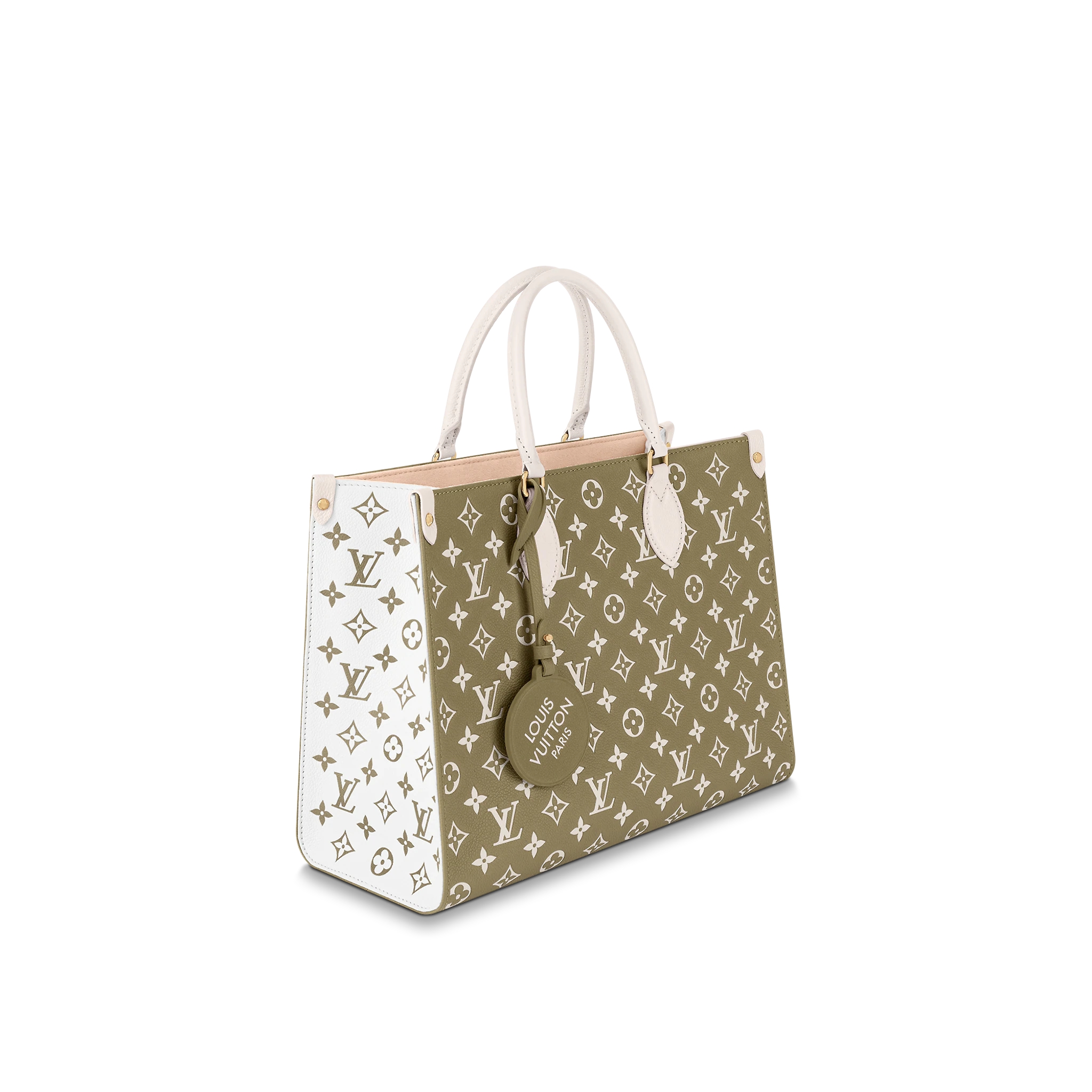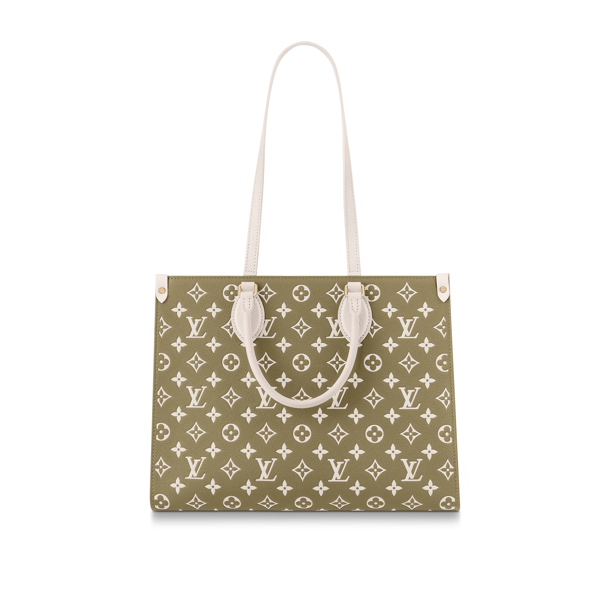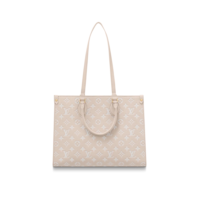 The OnTheGo tote bag is made from Monogram Empreinte cowhide leather, featuring the Monogram pattern on different-colored leathers. The classic Monogram motif is first embossed, then printed on the leather. This is a roomy bag and can easily fit a laptop. Its two sets of handles, short and long, give carry options.