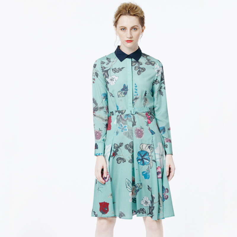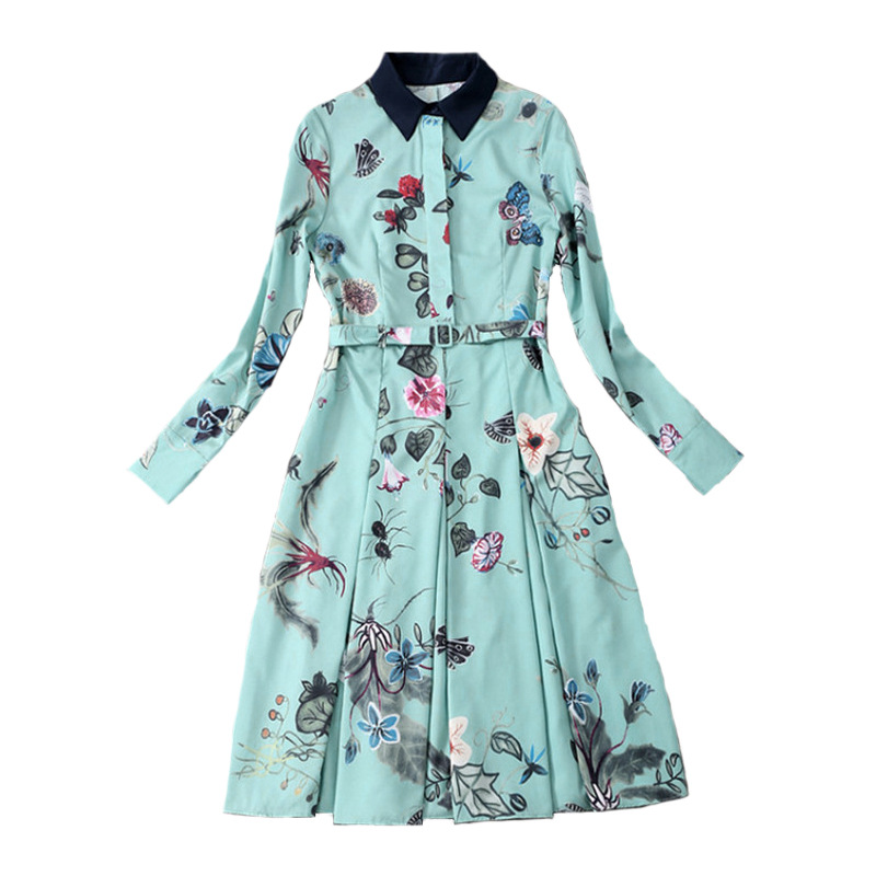 Yang Mi star with the same dress silk shirt lapel long sleeves elegant green European and American print thin mid-length skirt