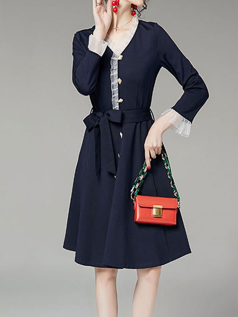 Mapping high-end big-name solid color high-waisted commuter European and American style tie-stitched long-sleeved fashionable dress