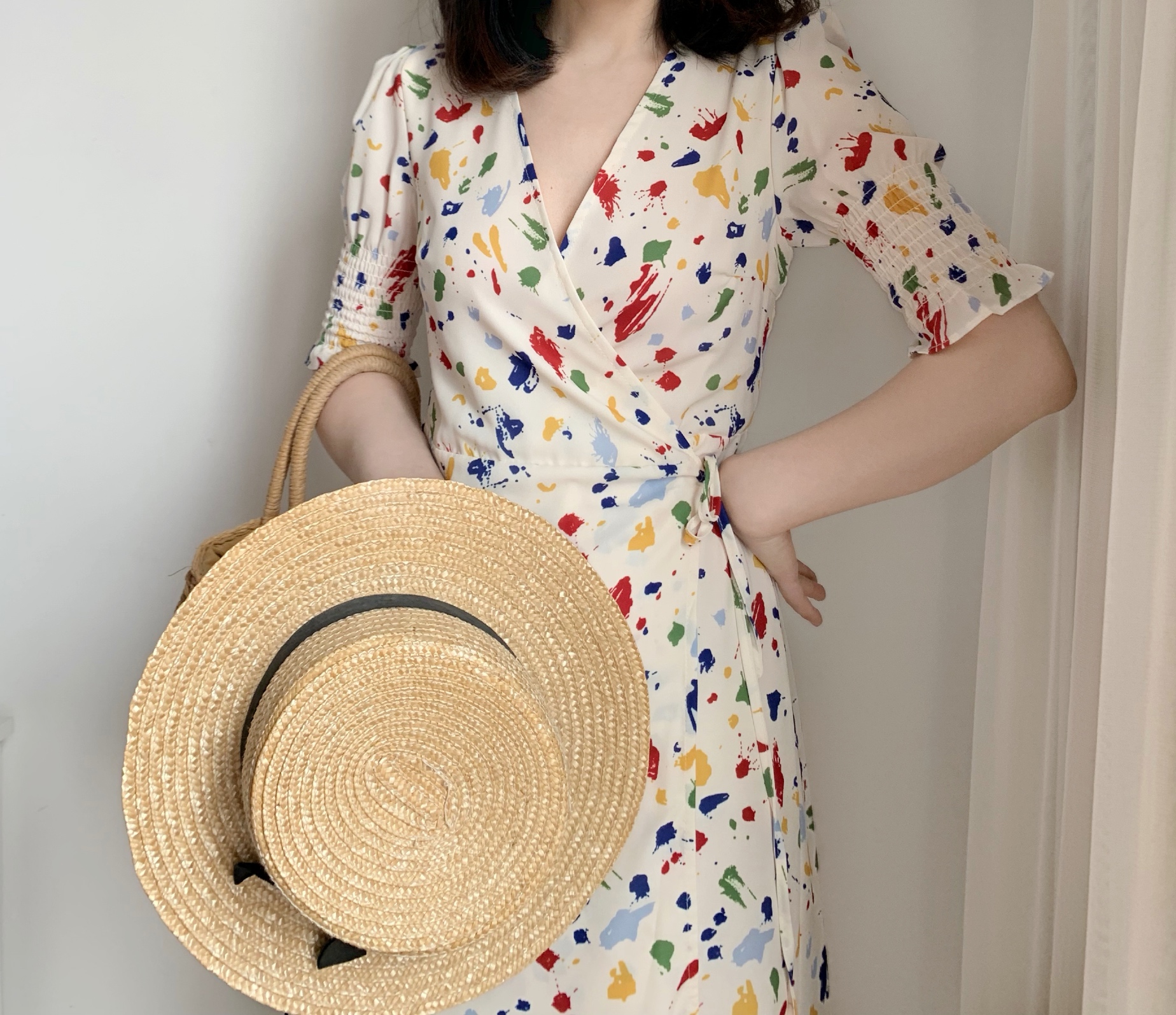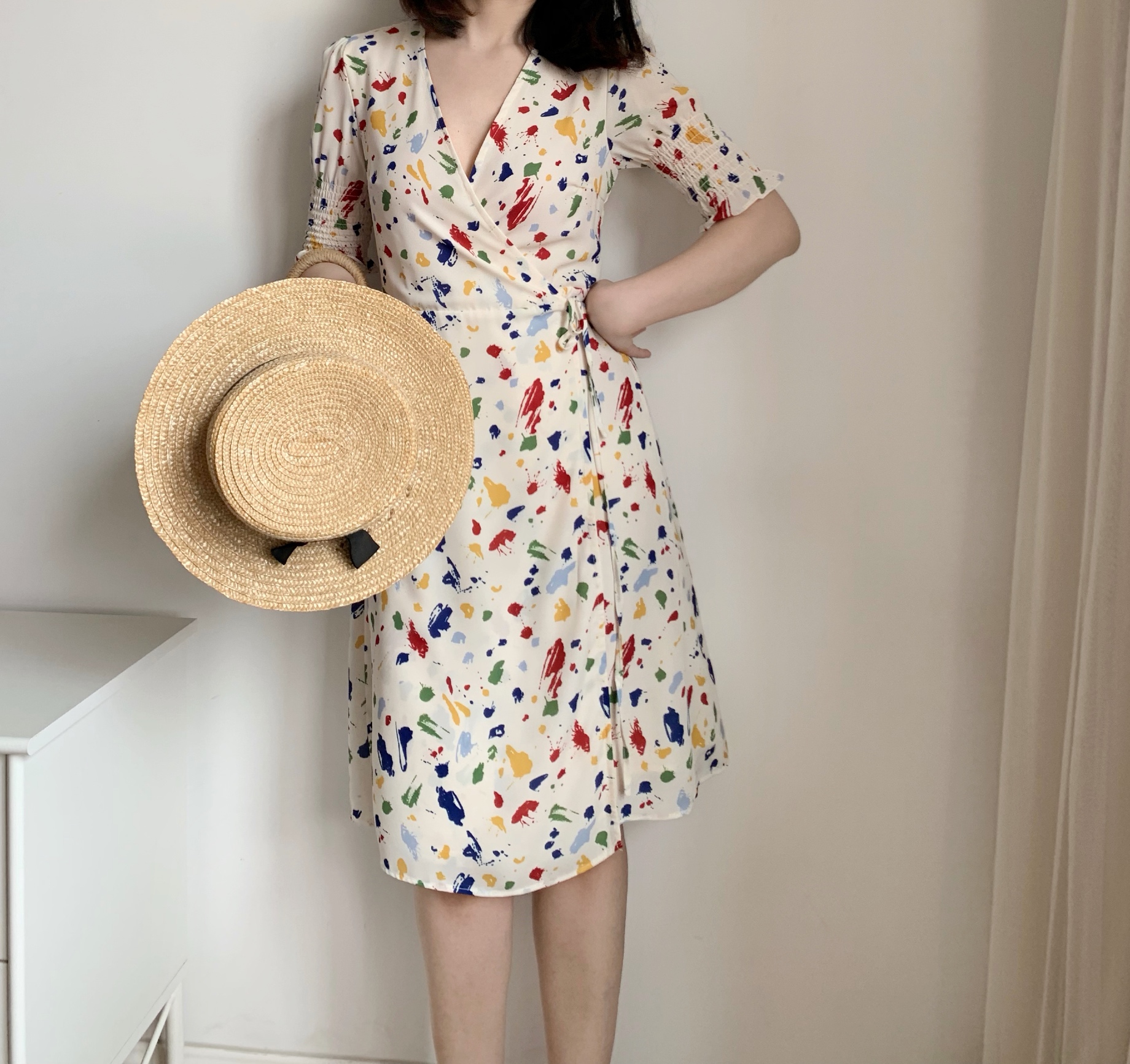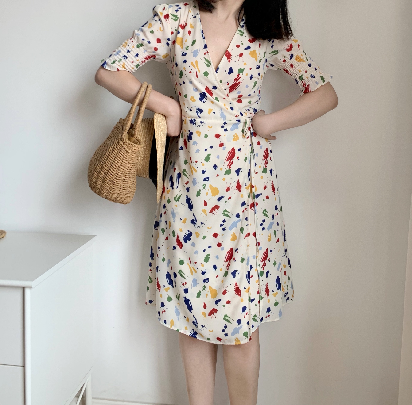 New French blogger v-neck retro splash ink fresh bubble sleeve waist slimming fairy skirt wrap dress