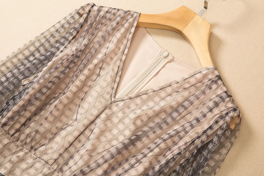 Focus on fashion European and American women's new light luxury ladies V-neck long-sleeved prismatic mesh slim-fit mid-length dress