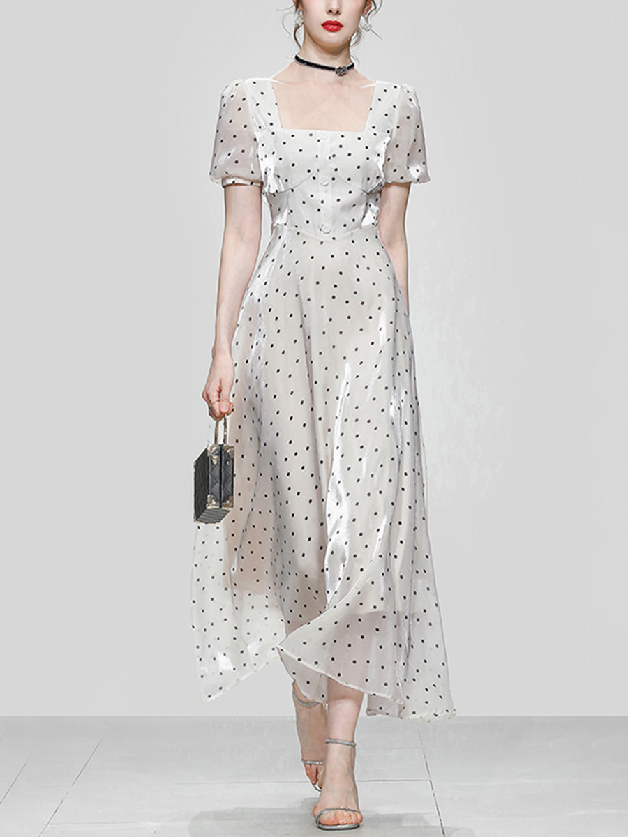 Brand: Lareey Size: S M L XL Fabric: Woven pattern: Polka Dot style: Commuter: retro collar: square collar waist: middle waist front: zipper Color classification: light apricot sleeve: Bubble sleeve Combination form: single item No. : LA0517-1 Skirt: Big swing applicable season: Summer year Season: spring 2022 Sleeve length: Short sleeve skirt length: Long skirt profile: A Profile quality: other 100%