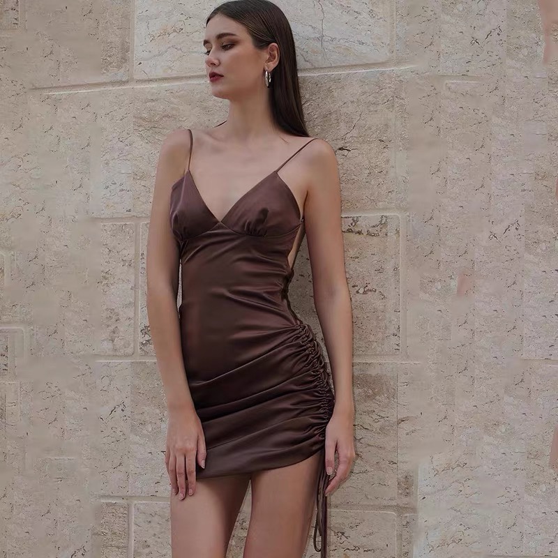 European and American satin single side drawstring V-neck halter dress Slim back sleeveless spice girl hip wrap skirt skirt