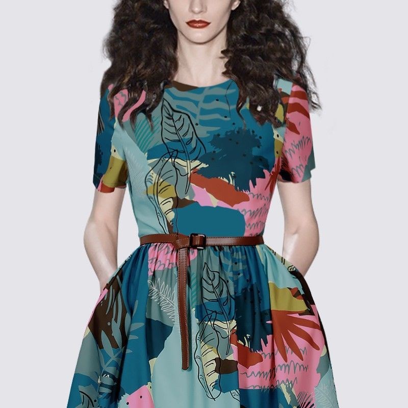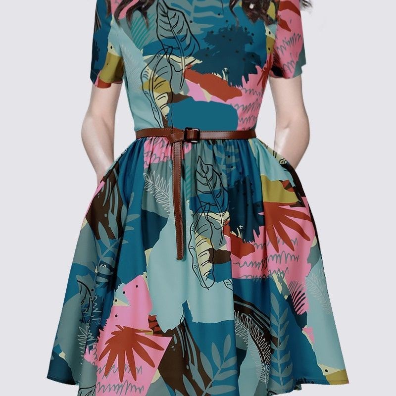 Masfil Summer 2022 Printed Dress with short sleeves and waist retraction, A line