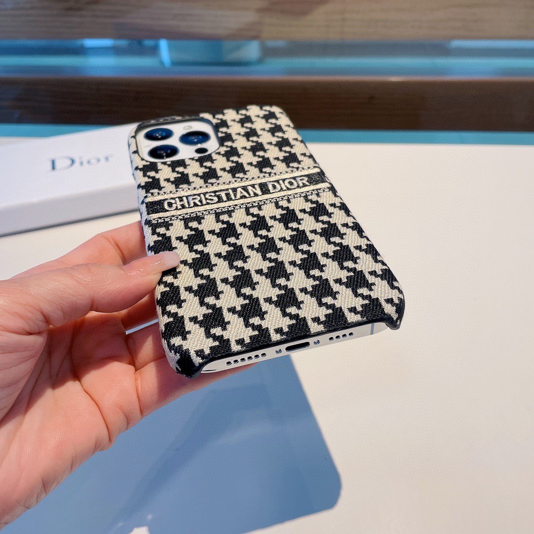 Dior houndstooth embroidery fabric mobile phone case, elegant atmosphere.