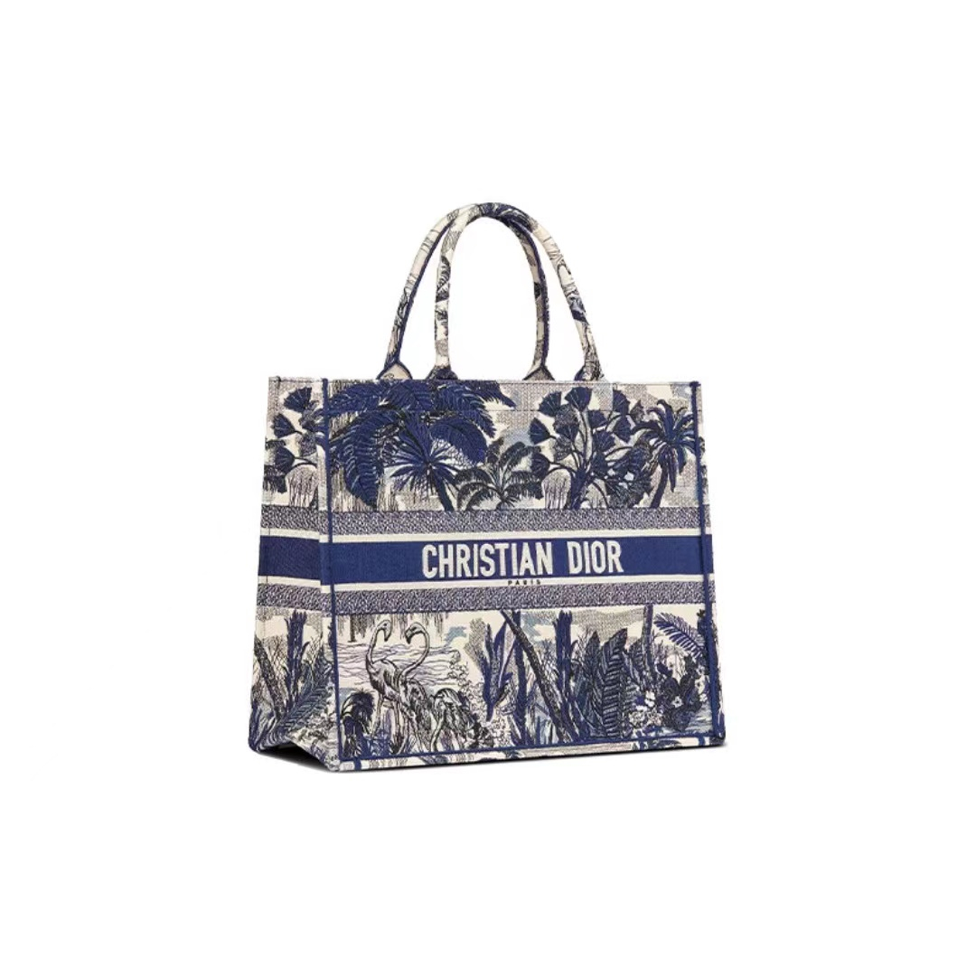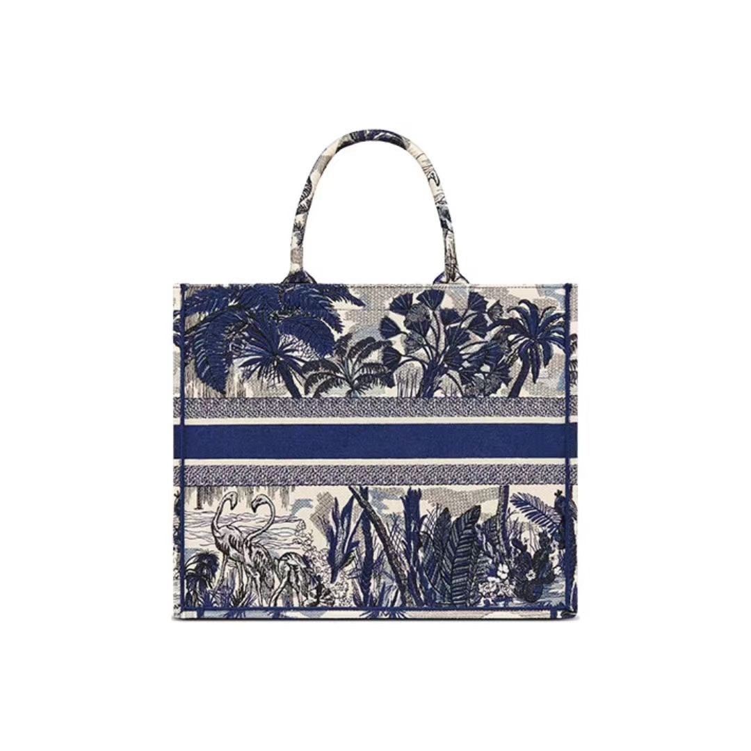 DIOR Book Tote tote bag series palm tree Toile de Jouy pattern embroidery printing one-shoulder handbag tote bag large size women's style blue