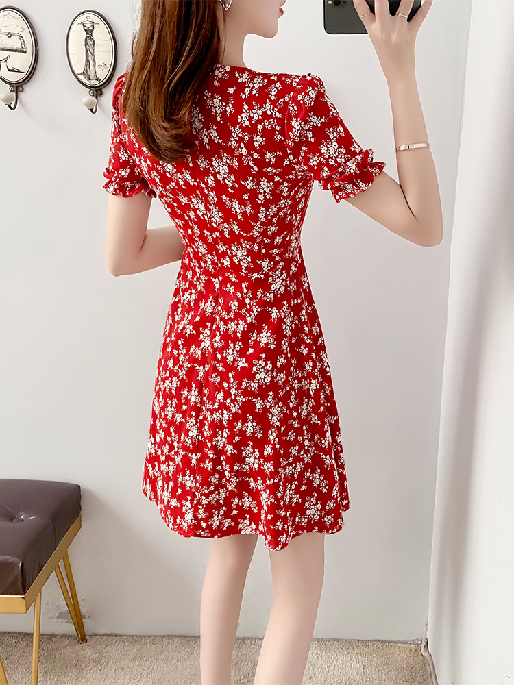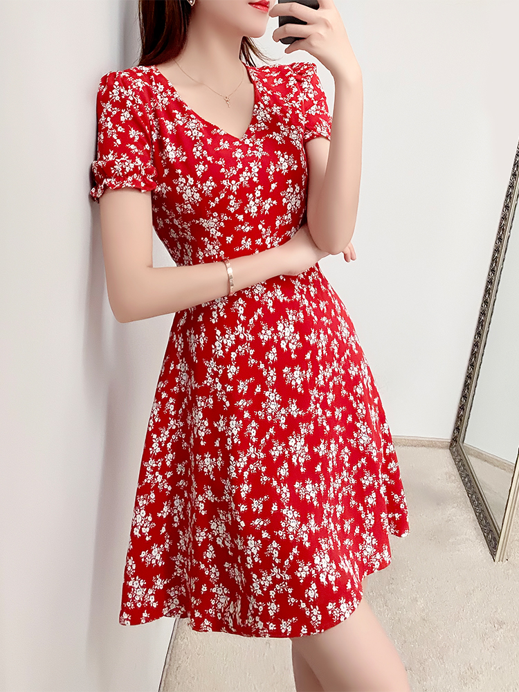 Applicable age: 25-29 years old size: S size [suggested 80-98 catty] M size [suggested 98-108 catty] L size [suggested 108-120 catty] XL size [suggested 120-140 catty] 2XL size [suggested 140-160 catty] 3XL size [suggested 160-180 catty] 4XL size [suggested 180-200 catty] Fabric: Polyester other patterns: plant flowers floral style: Commuter commuter: Korean collar: V-neck large size women's classification: dress Color classification: red blue Sleeve type: Horn sleeve combination form: single item No. : 1673 Skirt Type: Fllotus skirt applicable season: Summer Year Season: 2022 Summer Sleeve length: Short sleeve skirt length: Medium length dress way: set head thickness: thin length: medium length clothing version: slim clothing process: three-dimensional cutting