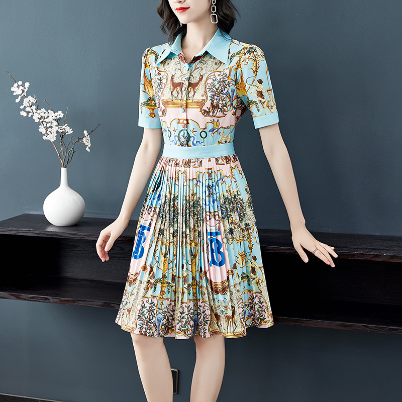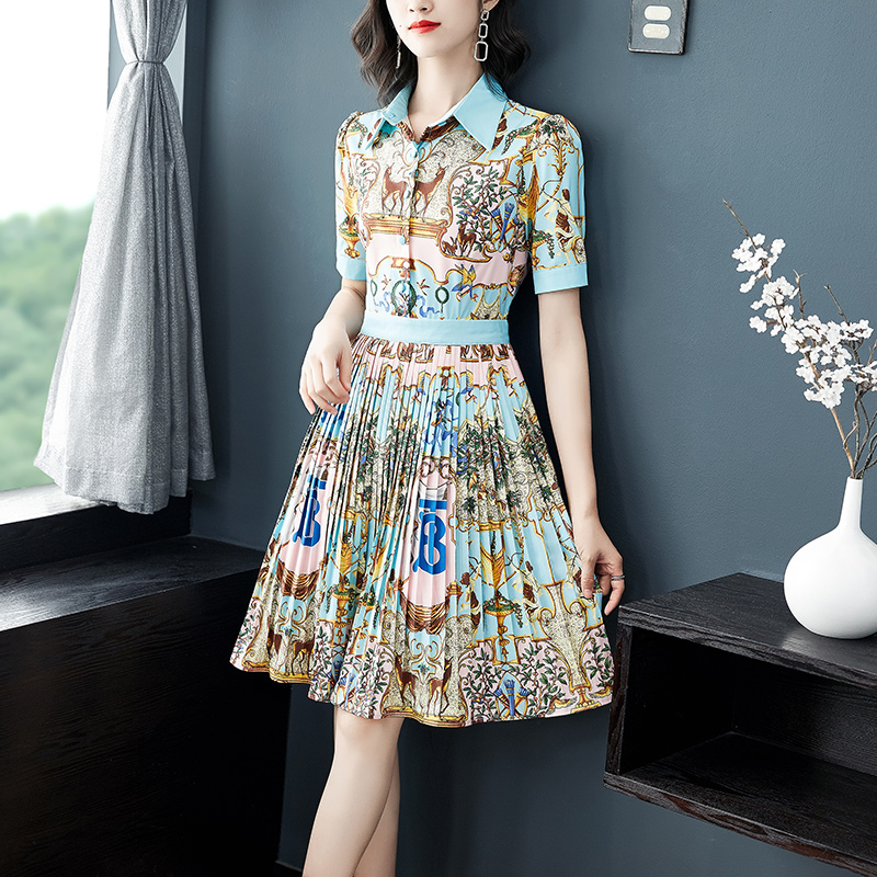 The new lapel, short-sleeve, waist-in summer 2022 fashion print dress with pleats is trendy