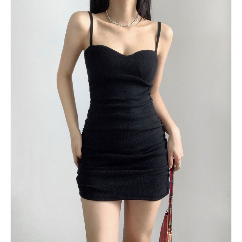 Europe and The United States with chest pad black strap dress spring and summer take shoulder clavicle show thin fold hip a word short skirt