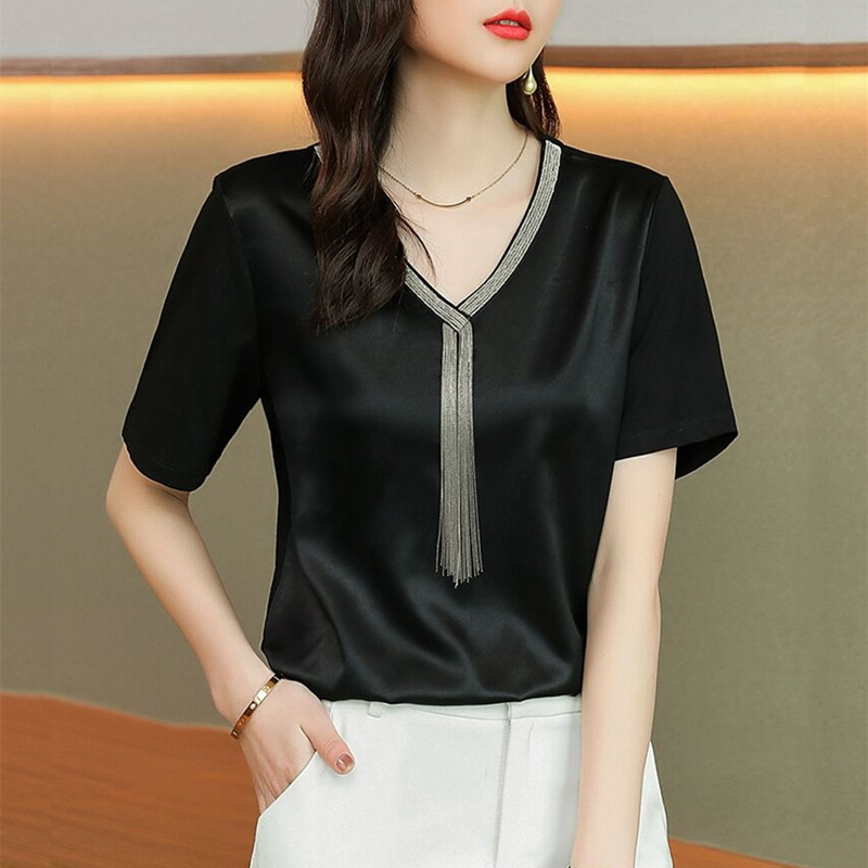 SANDRO Women's Blouse Summer European and American light luxury Tassel V-neck short sleeves slim slim silk satin T-shirt