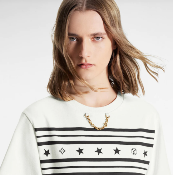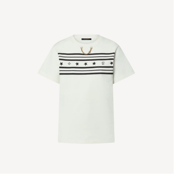 This T-shirt presents the star pattern, stripes and brand logo on the chest, adding sports options to LV Summer Stardust capsule series. Shurou cotton knitting cuts out the classic version, and the brass chain with round neck points out the signature brushstrokes.