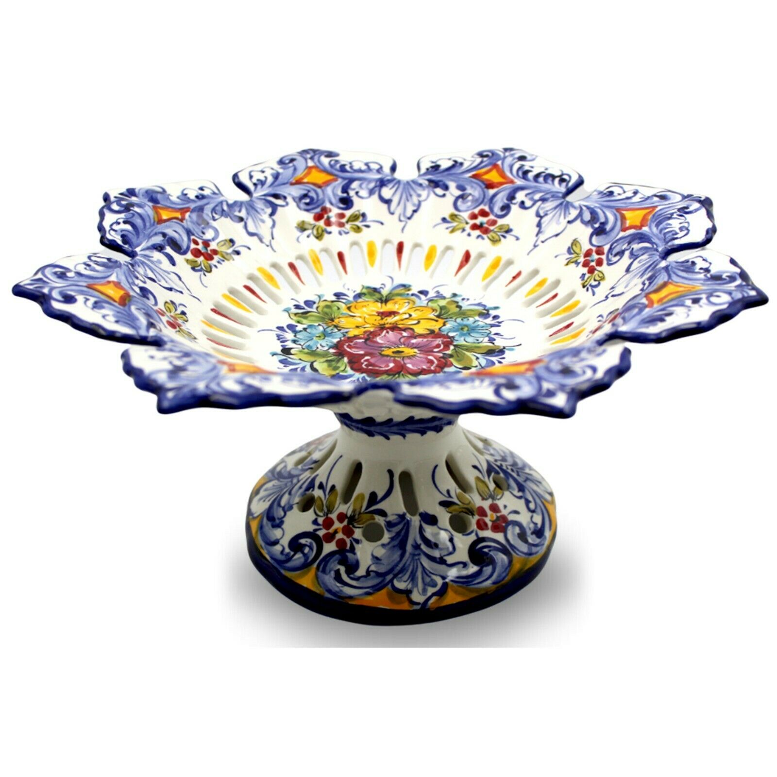 Hand-Painted Traditional Floral Ceramic Footed Fruit Bowl, Made in Portugal