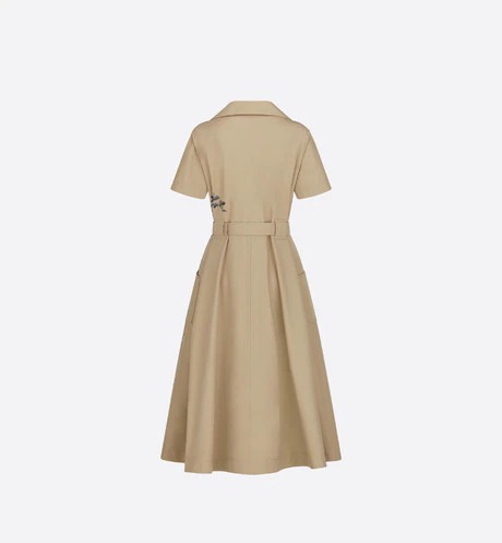 Decorated with the collection's signature Dior Jardin D 'Hiver pattern, the dress played the Mr. Dior tapestry in a poetic and exotic design. Crafted in beige gabardine, the horn profile is paired with a toned belt, large pouches and pleat details to accentuate the waist curve. It can be paired with other Dior Jardin D 'Hiver single products to create a delicate shape.
