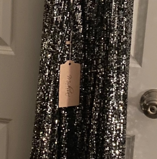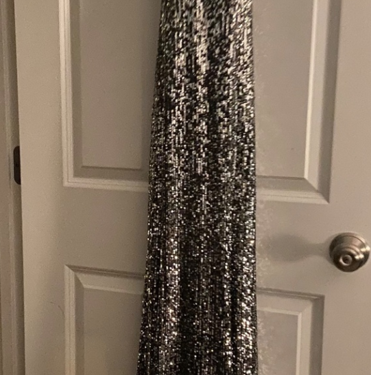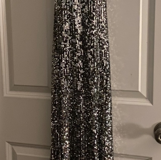 Silver/pewter long, sleeveless prom gown. To the floor with a wavy hem. Plunging neckline with mesh modesty panel. Plunging back. New to this so I’m not sure why it’s not showing the full photo. Happy to send more.