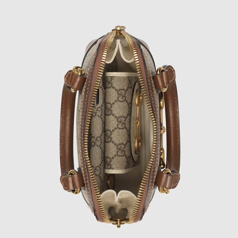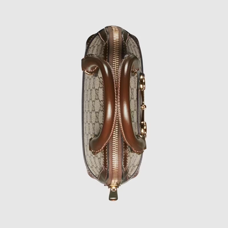 A new introduction to the Gucci Horsebit 1955 series, the mini top handle is made of branded logo canvas with contrasting brown leather details.