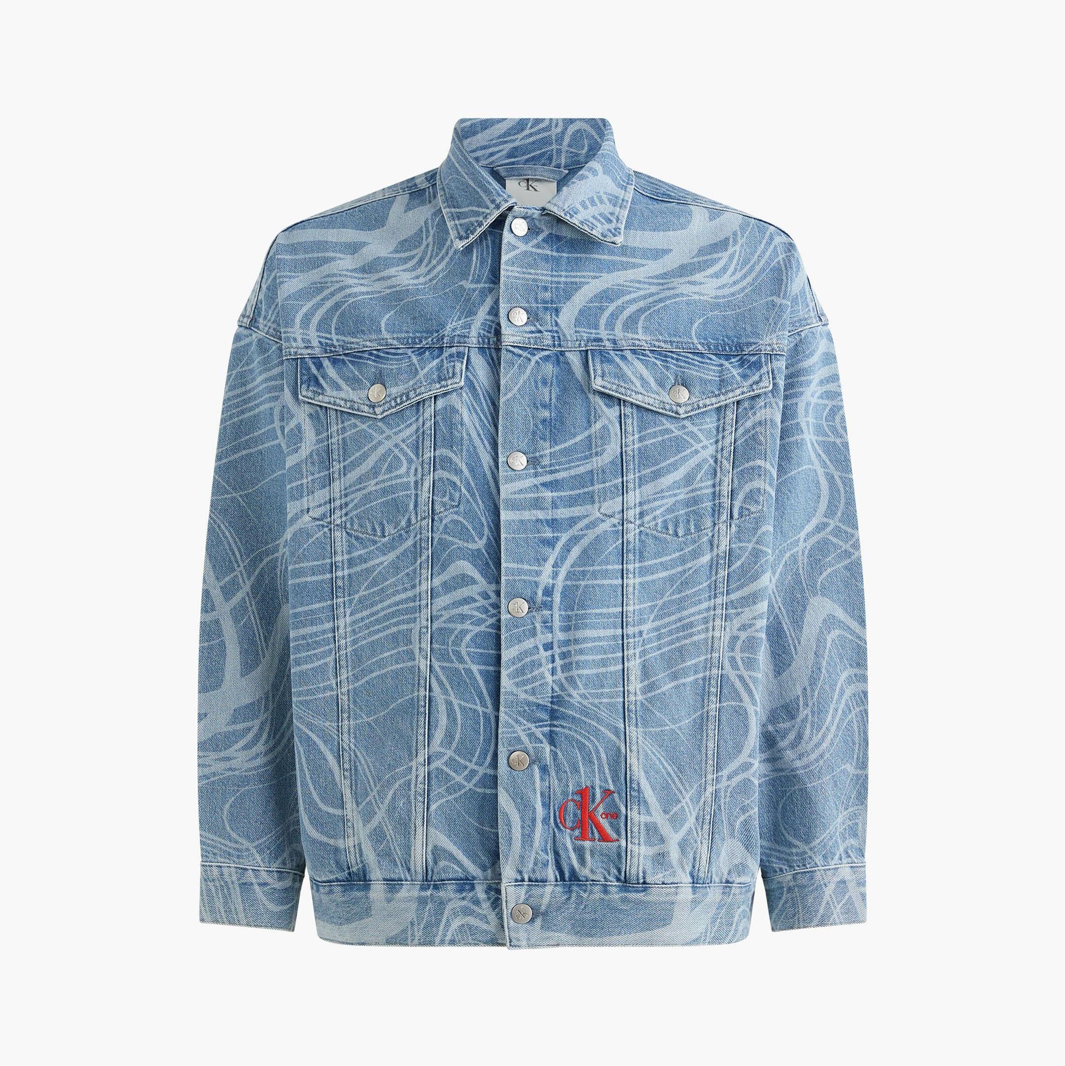 The statement denim trucker jacket from Calvin Klein Jeans is cut to a gender-fluid silhouette. Graphic lines and a contrast CK One embroidery complete the look.