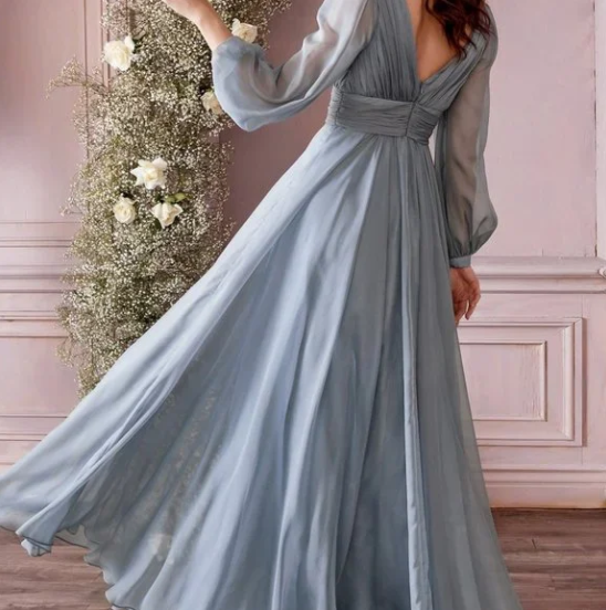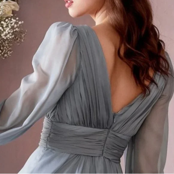 COLOR SMOKEY BLUE Material: 100% Polyester Open Back Long Dress CHIFFON LONG SLEEVE DRESS LongA-LINE Silhouette Occasion: Formal, Evening, Cocktail, Guest of Wedding, Bridal, Bridesmaid, Mother of the Bride, Gala, Party, Banquet, Prom, Ball, Homecoming, Graduation, Special Occasion.