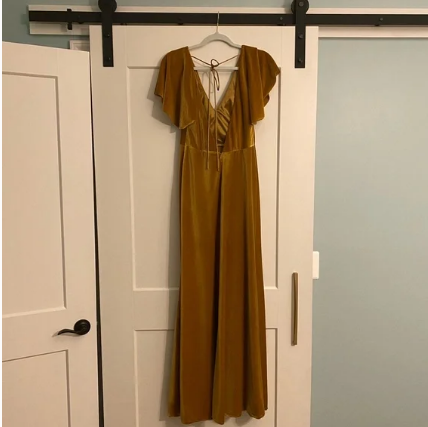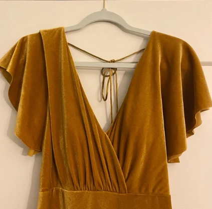 Color Marigold Flutter sleeves and a v-neckline top off this fitted, floor-skimming dress in luxurious velvet. An open back topped with a slender tie makes a dramatic finishing touch. Backless strapless bra-friendly Size 6 measures 62" from shoulder to hem Size 22 measures 65.5" from shoulder to hem Backless strapless bra-friendly Back zip Polyester, spandex; polyester lining Professionally clean