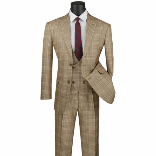 VINCI Men's Camel Beige Glen Plaid 3 Piece 2 Button Classic Fit Suit NEW