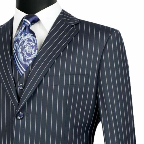 VINCI Men's Navy Blue Banker Stripe 3 Piece 3 Button Classic Fit Suit NEW