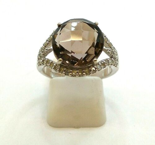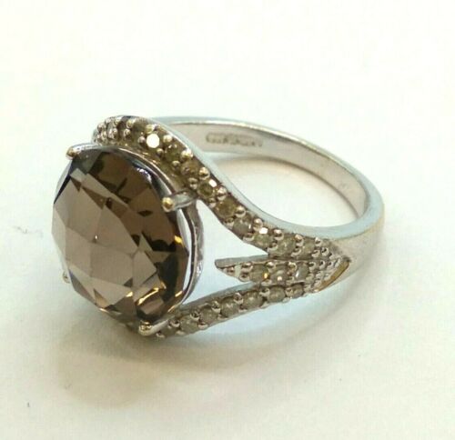 9CT GOLD RING SMOKEY QUARTZ DIAMOND RING SIZE O RING