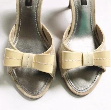 Louis Vuitton Mini Lin Bow Monogram Heels Color: Dune Size: 36 Great pair of preloved LV sandals. Perfect for summer. Some light discoloration/wear from normal use. No box.