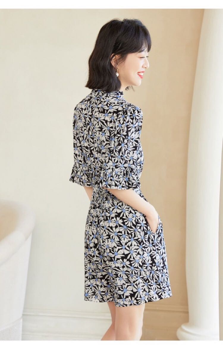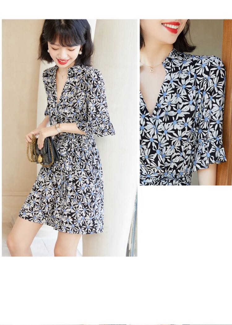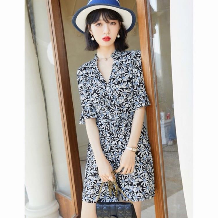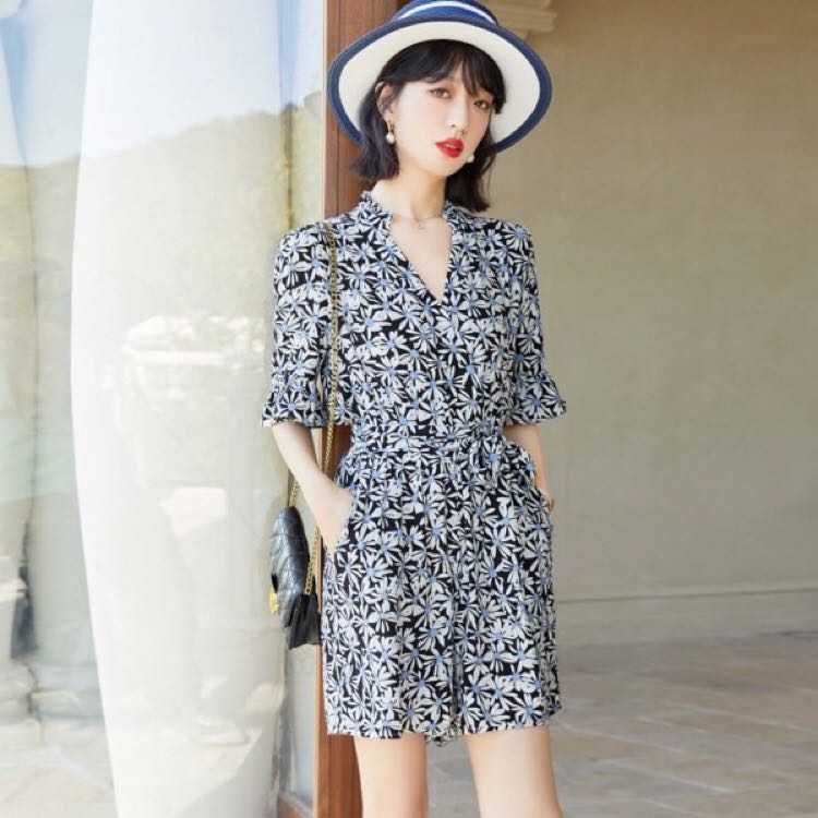 Summer 2022 French resort vintage floral sleeve Chiffon high belt one-piece shorts