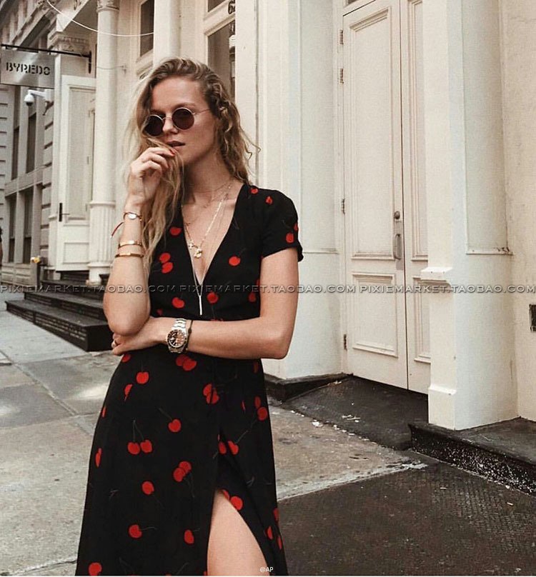 European and American holiday beach skirt cherry print short-sleeve v-neck lace-up long skirt wrap dress woman