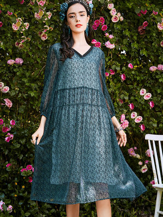 High-grade slim v-neck silk velvet dress 2022 spring and autumn new temperament printed mulberry silk skirt women