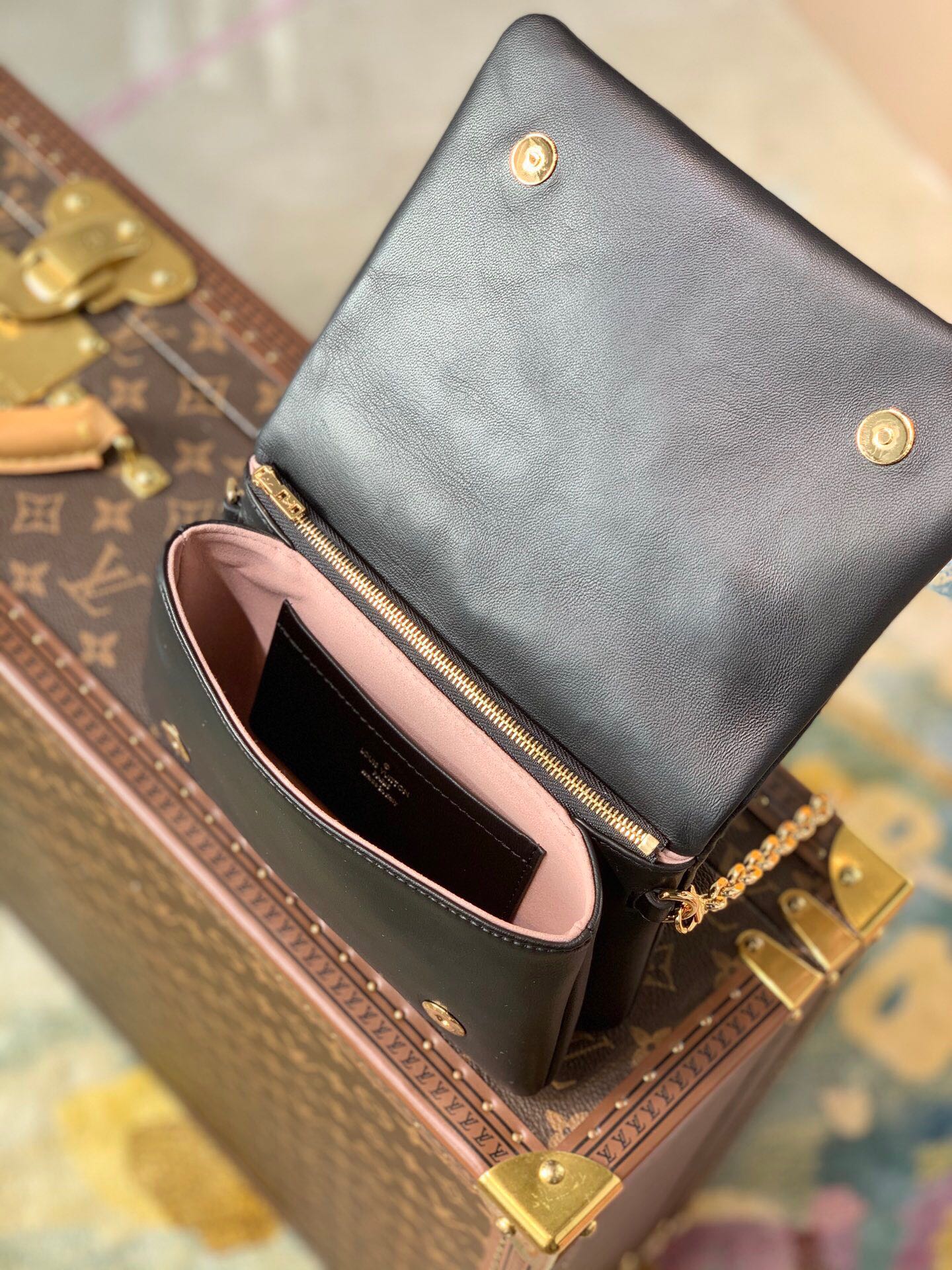 M80742 is made of monogram embossed sheepskin, which is as soft as a pillow. With a detachable chain decorated with Louis Vuitton ornaments, it can also be used as a clutch bag or waist bag.
