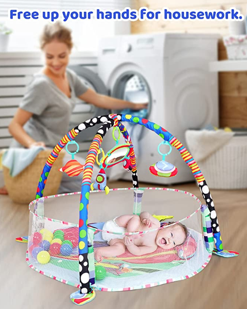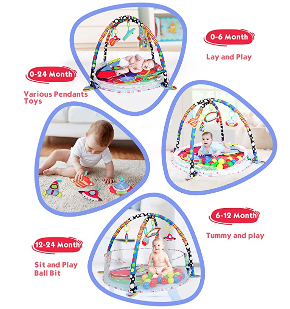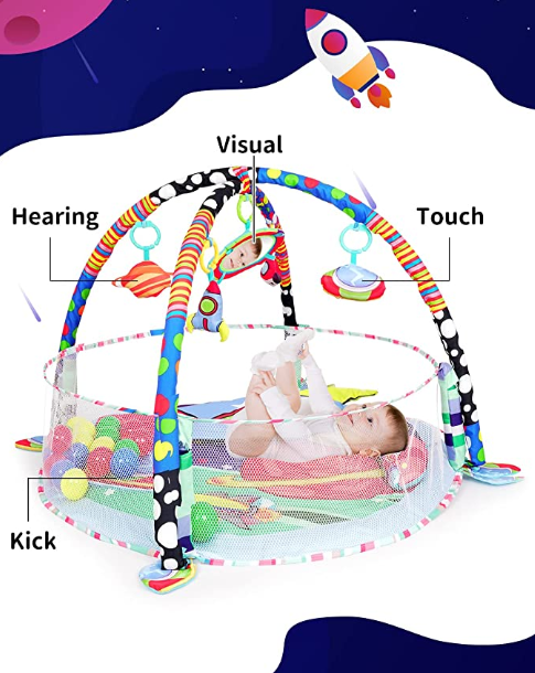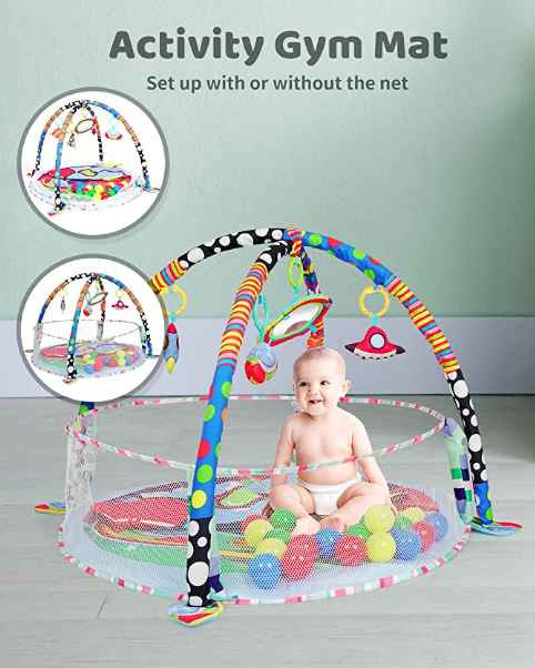 • ?COLORFUL BABY ACTIVITY GYM: Infant love to grip any new bright and colorful thing. Our activity mats come with a variety of sensory cognitive hanging toys that stimulate baby's visual, hearing and tactile, cognition and body coordination. Provides baby full of great comfort when baby lying and sitting, and plenty of space for continuous fun.