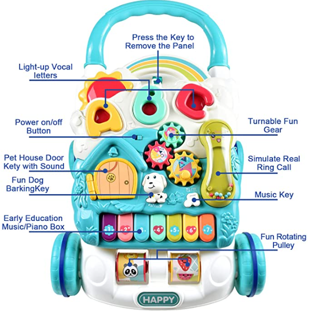 • Early Educational Activity Table Toy: Removable game panel comes with shape recognition block, colorful turn-able gear,light-up buttons,7 piano keys that play music and encourage creativity ,pretend telephone handset bring role-play fun. This learning walker toys could also enhance your kids’ hand-eye coordination, finger flexibility,and sensory skills. Requires 3 x 1.5AA batteries (not included)