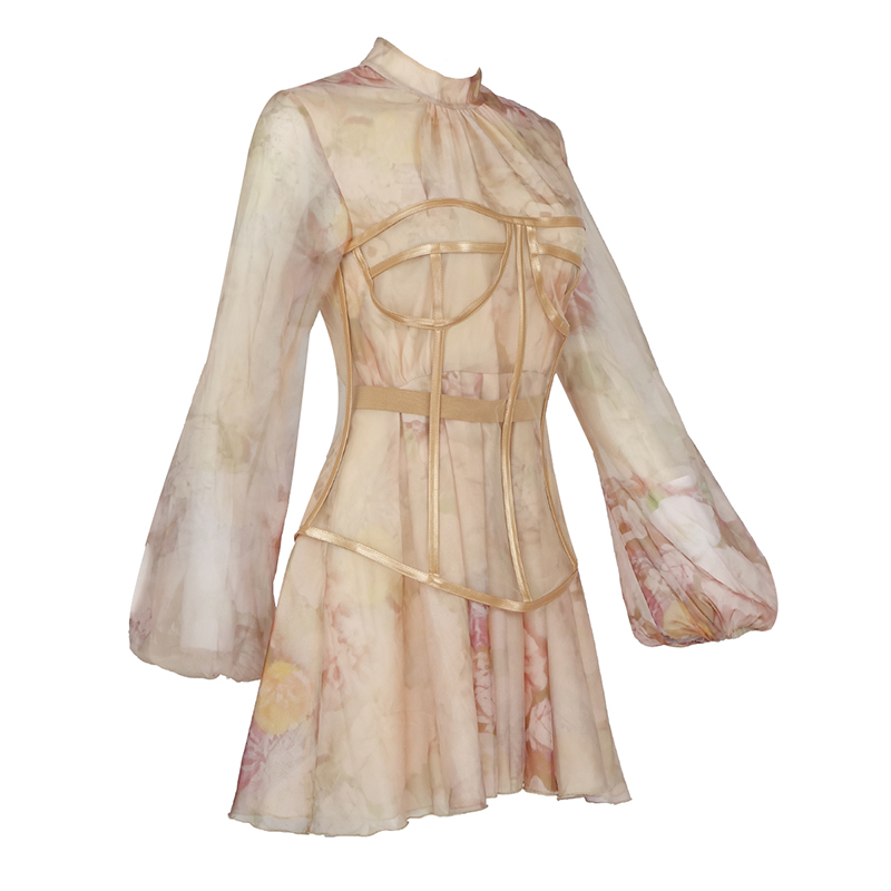 2022new European and American waist print yellow lady cross-border dress niche temperament long-sleeved stand-up collar dress
