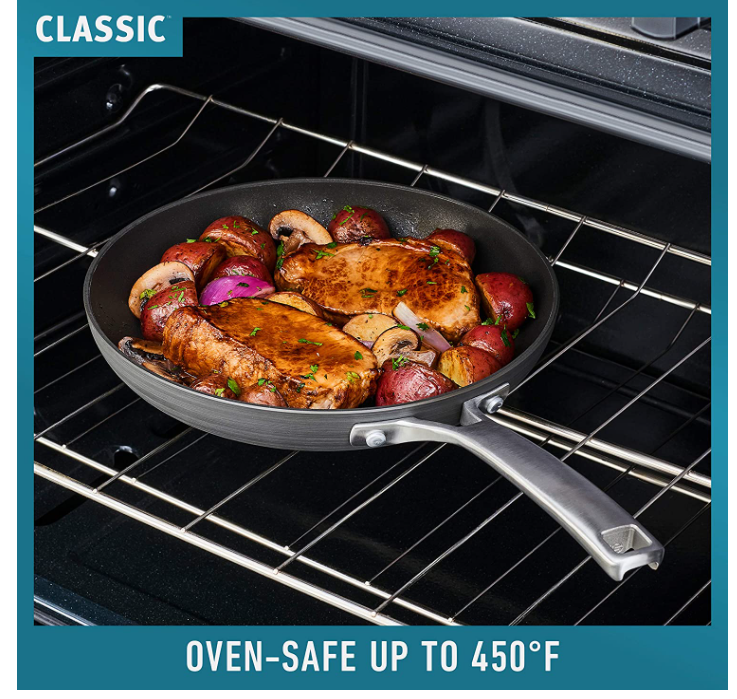 • Cookware is oven-safe up to 450 degrees F, safe to use on gas, electric, glass, and halogen stovetops, and is hand wash only; silicone insert is top-rack dishwasher-safe