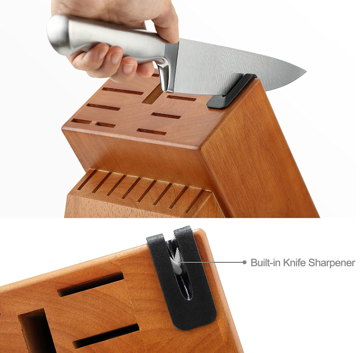• EXCLUSIVE BUILT-IN SHARPENER – Stainless steel knives sets with built-in sharpener is a handy bonus. It saves you from having to honing blades on a sharpening steel.