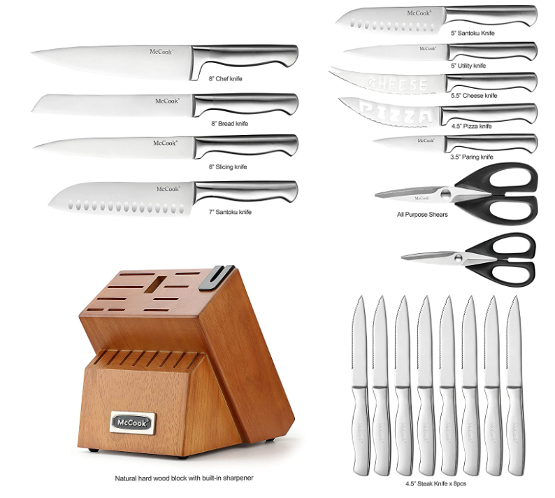 • WHAT YOU GET – 20 pieces knife block set includes 8" chef knife, 8" slicing knife, 8" bread knife, 7"santoku knife, 5" santoku knife, 5.5" cheese knife, 4.5" pizza knife, 5" utility knife, 3.5" paring knife, 8pcs 4.5" serrated steak knife, 2 pairs of kitchen shears and hard wood knife block with built-in sharpener