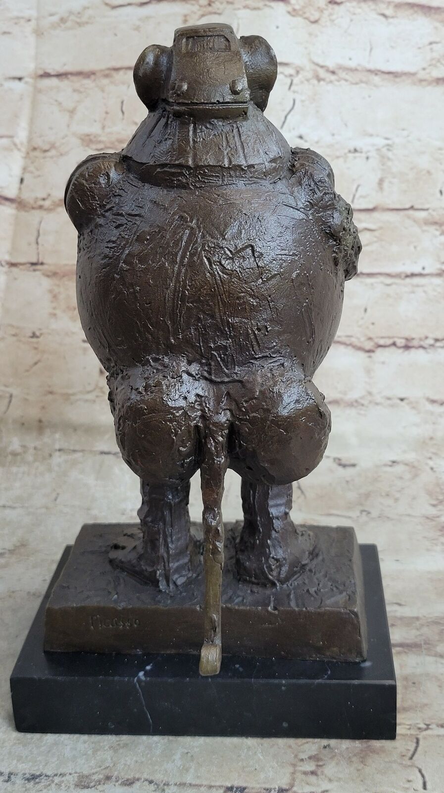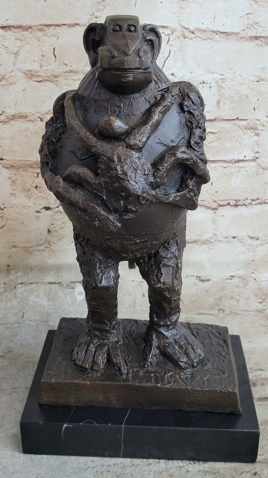 Signed Abstract Baboon and Young Green Patina Bronze Sculpture Marble Statue Art