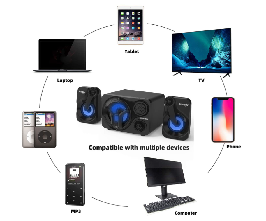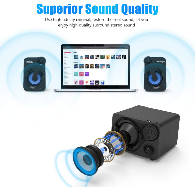 • ?【POWERFUL SUBWOOFER FOR ​PREMIUM 2.1 AUDIO】Enhanced with a built-in subwoofer, this computer speaker set provides booming sound and a strong, loud bass for premium audio sound.This subwoofer speaker system delivers 30 watts peak power and 20 watts RMS,With this kind of power you can expect quality sound at any volume level,filling any large room in the living room or office,Enjoy the shocking auditory experience.