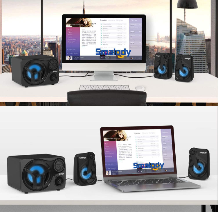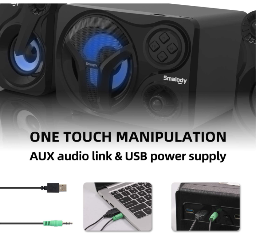 • ?【GLOWING LED SPEAKERS】Music conveys emotions, lighting creates beauty. Cool blue ambient light effect, highlighting the sense of science and technology bring a vibrant look to your desk, office or home setup.The overall cool glowing design makes this computer speaker with bluetooth unique,it would be a wonderful gift for Gaming lovers.
