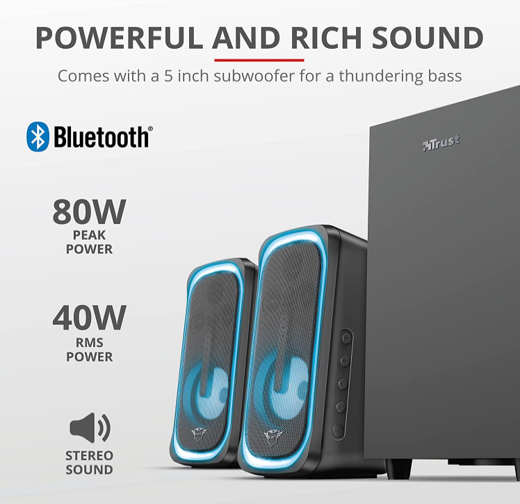 • Hochwertiges 2.1-Lautsprecherset mit leistungsstarkem, sattem Sound (Spitzenleistung 80 W). Verschiedene Plattformen: Verwendung mit Laptop, PC, Smartphone, Tablet, Spielekonsole, TV-Gerät oder Set-Top-Box