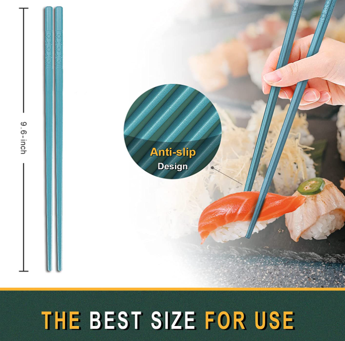 • Material: This 10 pairs of chopsticks set is made of high-quality fiberglass, without lacquer, paint and wax, it is a material that can be eaten with confidence, it is a food utensil. Fiberglass provides better protection against corrosion, mold or stains than other materials such as wood, bamboo, plastic or metal.