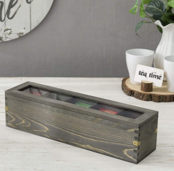 MyGift 5 Compartment Vintage Grey Solid Wood Tea Bag Holder Storage Box with Clear Transparent Lid and Brass Metal Trim Packaging