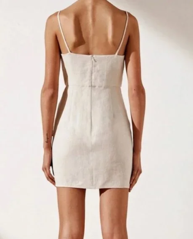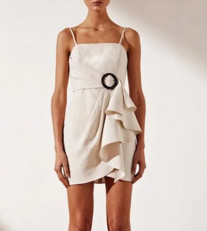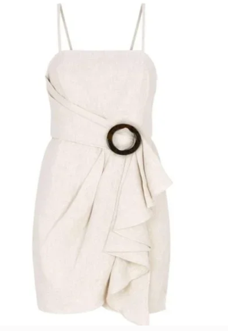 Aluaro Draped Mini Dress. Draped mini dress in a pure light weight linen in a natural stone hue. this dress features adjustable spaghetti straps, straight neckline with lined bust, draped fabric belt with fixed oversized resin tortoiseshell buckle, invisible back zip and cross over draped mini skirt. Size 8 US / 12 AUS.