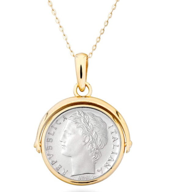 • CLASSIC FASHION ELEMENTS - Inspired by the concept of timeless beauty, this Italian reversible swivel pendant features a genuine 100 Lira coin, polished round medallion frame, sterling silver plated with 18K yellow gold. The back is decorated with Minnea, the goddess of wisdom, and the front is a head in a classic style, symbolizing the Italian crown laurel. Cycle 1955-1992. The adjustable polo chain lets you wear it as a short choker up to 24 inches in length.