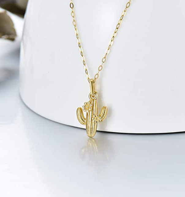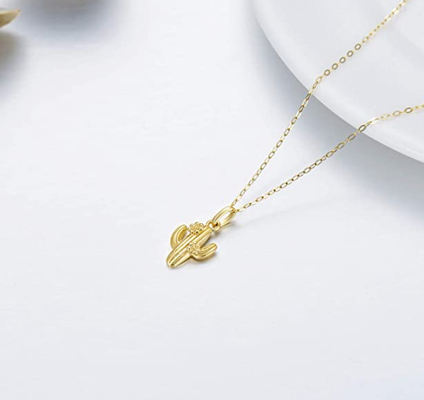 Ayafee Cactus Necklace 10k 14k 18k Yellow Gold Cactus Pendant Necklace, Cute Plant Flower Necklace, Cute Ladies Girl Friends