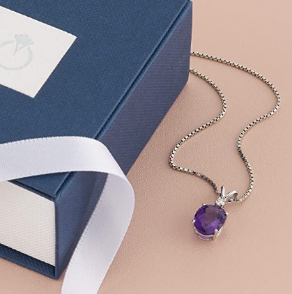 • LUXURIOUS GOLD PENDANT FOR EVERYDAY - Indulge in this beautiful dainty Amethyst pendant for women made of Premium 14K Gold for a durable and hypoallergenic wear. Accented with Genuine Diamond, 0.05 Carat, H-I, SI-I Clarity. Comes ready to wear with a Sterling Silver 18 inch chain, Rhodium finished for a lustrous polish. Pendant measures 0.75x0.5 inches.