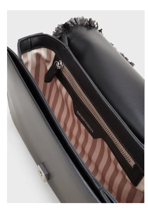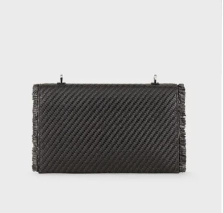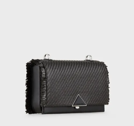 A simple, minimalist style defines this iconic bag featuring geometric lines and a semi-rigid construction. The two-toned, woven straw basketweave flap with decorative side fringes adds a summery touch. It comes with an adjustable, detachable fabric shoulder strap and a practical coin purse with a clip attachment. Dimensions: 25 x 16 x 7 cm.